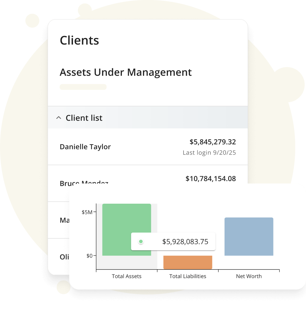 A unified, secure view of each client's full financial picture—including held-away assets—with role-based access.